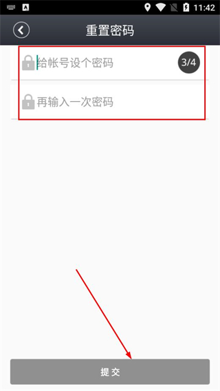 3、在密碼設(shè)置頁面輸入新密碼并重復(fù)確認(rèn),點(diǎn)擊提交即可完成密碼重置。