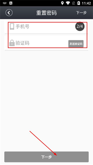 2、在重置密碼頁面輸入手機(jī)號(hào),填寫收到的驗(yàn)證碼,點(diǎn)擊下一步。