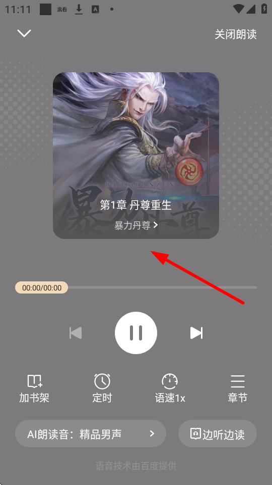 4、點擊后即可進入聽書模式,你還能在聽書界面進行加書架、定時、調(diào)整語速、選擇AI朗讀音等個性化設(shè)置。