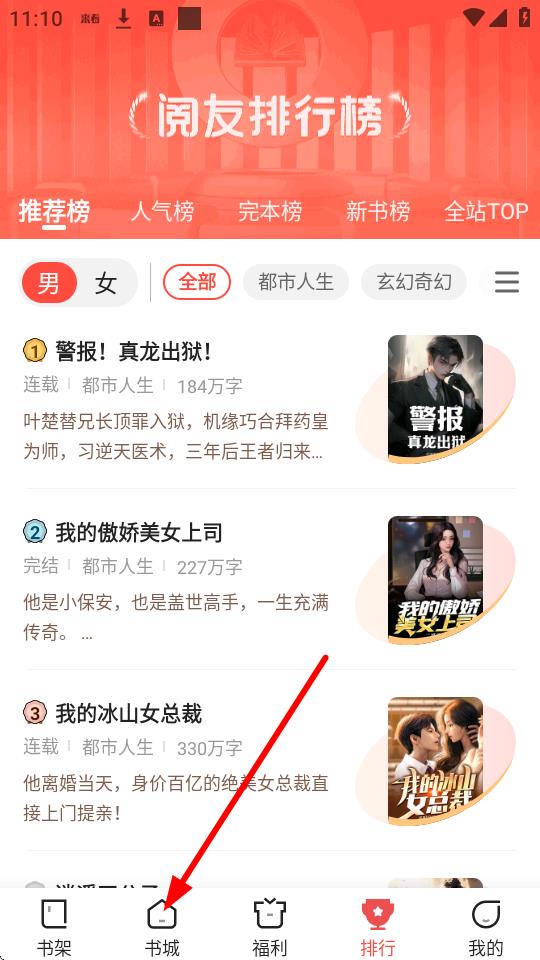 1、打開閱友小說APP,點擊底部導(dǎo)航欄中的書城選項,進入書城界面。