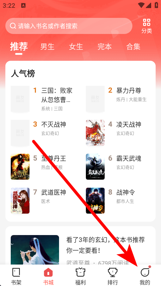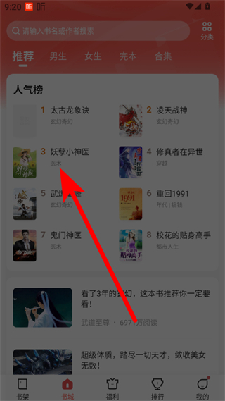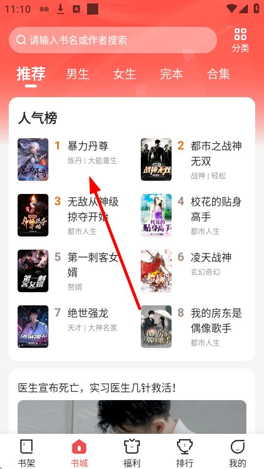 2、在書城界面,瀏覽并選擇想要聽的小說,比如點擊暴力丹尊。