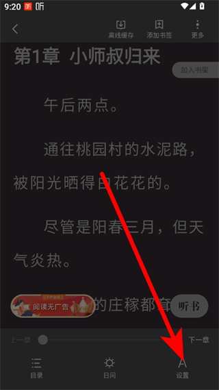 2、在小說閱讀頁面,點擊右下角設(shè)置選項,展開設(shè)置菜單。