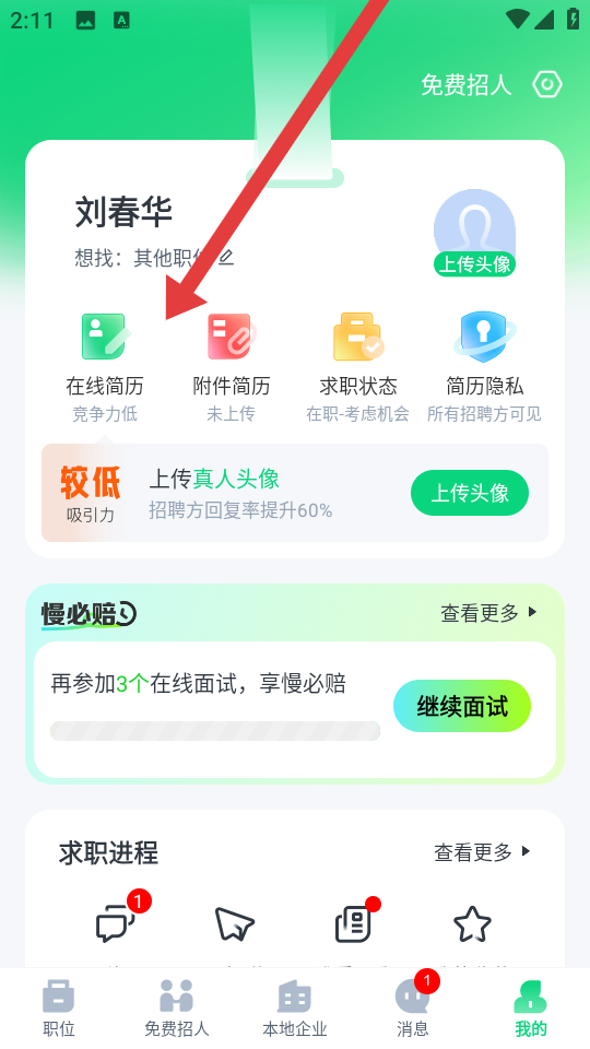 1、打開趕集直招APP,進(jìn)入我的的頁面,點擊在線簡歷的選項,進(jìn)入我的在線簡歷頁面。