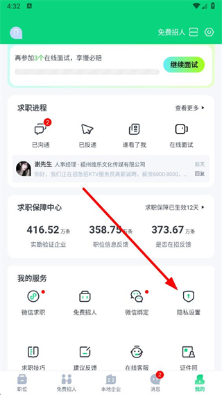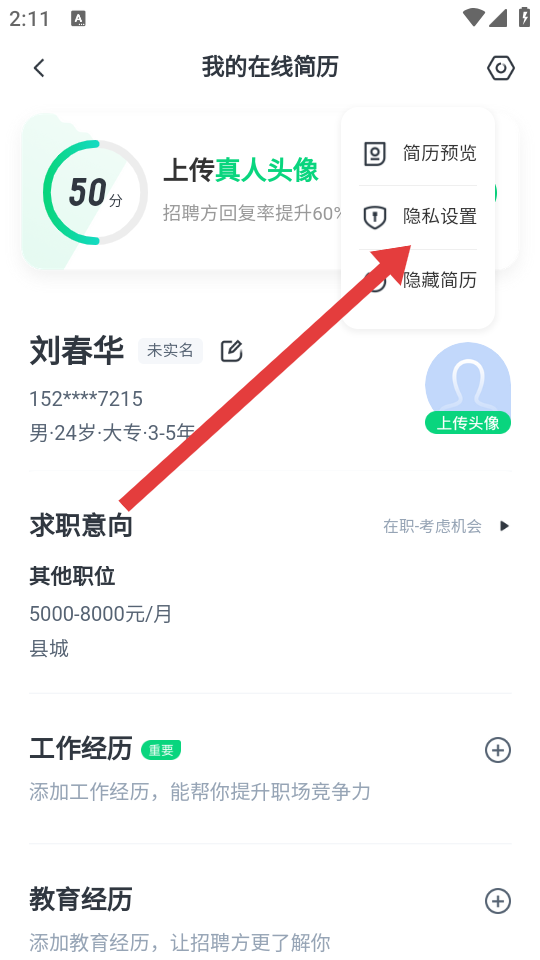 2、在我的在線簡歷頁面右上角點擊設(shè)置圖標(biāo),選擇隱私設(shè)置,進(jìn)入隱私設(shè)置界面。