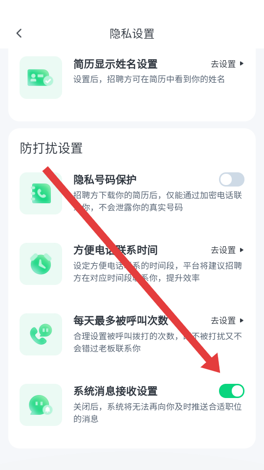 3、在防打擾設(shè)置板塊中,找到系統(tǒng)消息接收設(shè)置選項,點擊右側(cè)開關(guān)按鈕將其關(guān)閉。