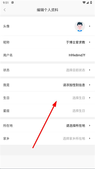 4、在編輯個人資料頁面可修改頭像、昵稱、狀態(tài)、性別、生日、星座、所在地、家鄉(xiāng)等個人信息。