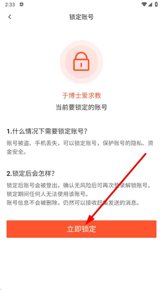 5、在鎖定賬號頁面點擊立即鎖定,即可鎖定賬號。