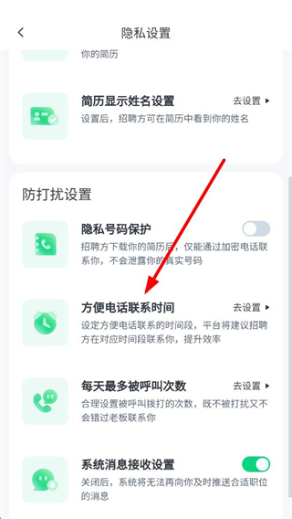 3、進(jìn)入隱私設(shè)置頁面后,點擊方便電話聯(lián)系時間選項。
