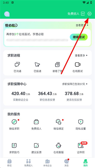 1、在趕集招聘app個人頁面點擊右上角設(shè)置圖標(biāo),進(jìn)入設(shè)置頁面。