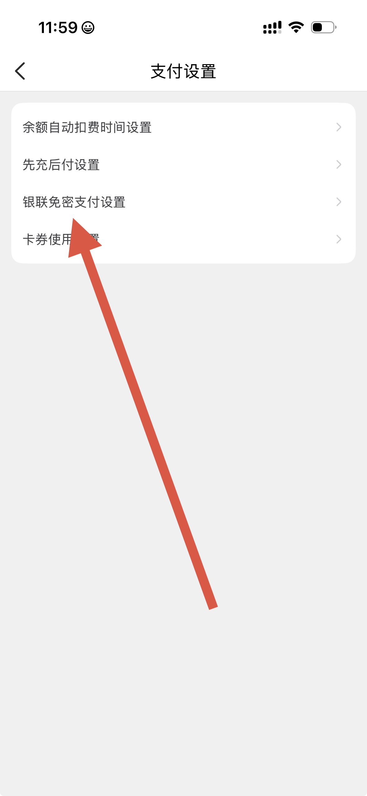 3、在支付設(shè)置頁面里,選擇銀聯(lián)免密支付設(shè)置等具體支付方式設(shè)置項(xiàng)。