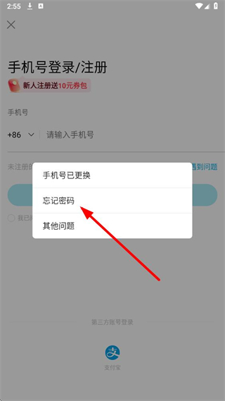 3、在彈出的菜單中,點(diǎn)擊選擇忘記密碼選項(xiàng)。