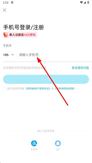 3、在手機(jī)號登錄注冊頁面,輸入要注冊的手機(jī)號,勾選相關(guān)協(xié)議后點(diǎn)擊下一步。