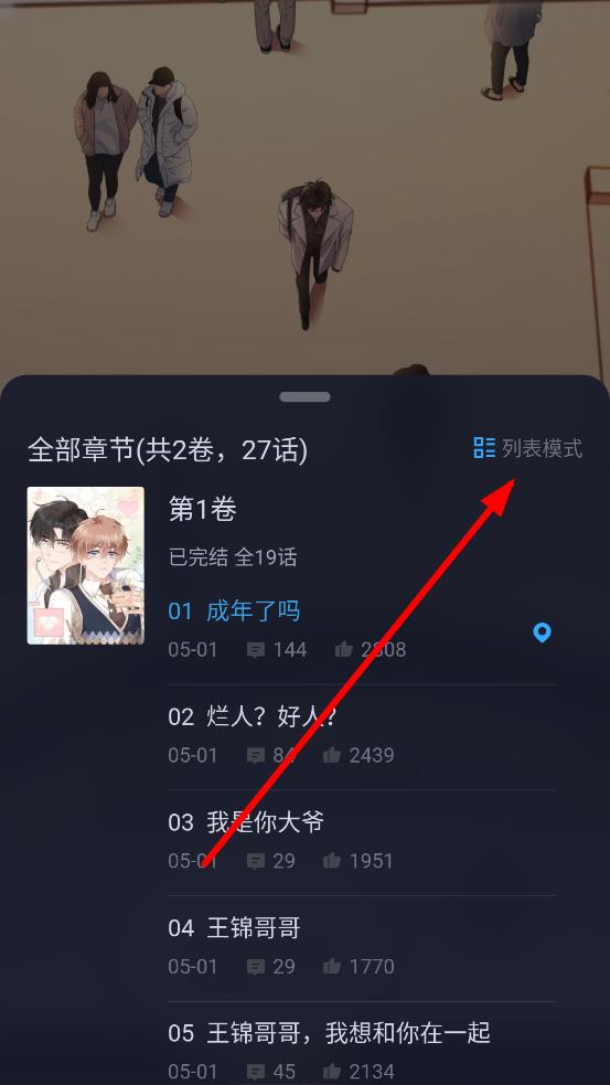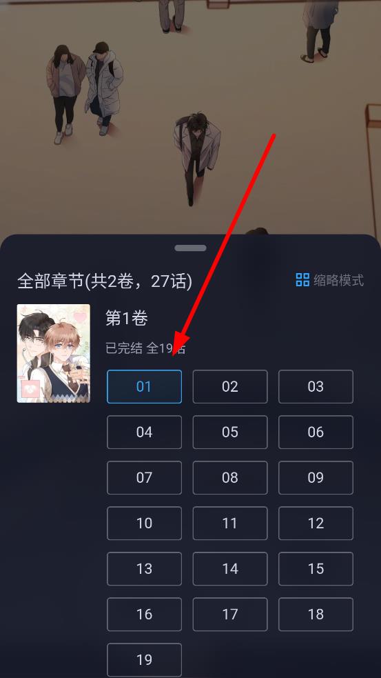 3、點(diǎn)擊后,會(huì)彈出模式選擇菜單,選擇縮略模式,此時(shí)目錄會(huì)切換成縮略模式展示,方便快速瀏覽和選擇漫畫(huà)章節(jié)。
