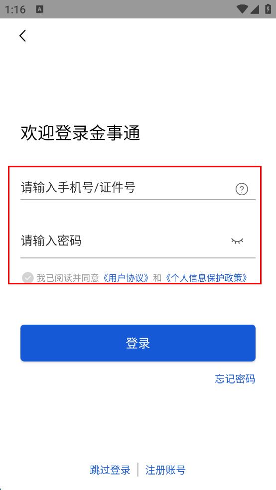 4、在登錄界面,輸入正確的手機(jī)號(hào)/證件號(hào)以及密碼,勾選“我已閱讀并同意《用戶協(xié)議》和《個(gè)人信息保護(hù)政策》”,然后點(diǎn)擊“登錄”按鈕,完成登錄操作。