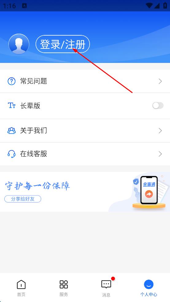 3、在個(gè)人中心頁(yè)面,點(diǎn)擊“登錄/注冊(cè)”按鈕,進(jìn)入登錄界面,此時(shí)可選擇輸入手機(jī)號(hào)/證件號(hào)和密碼進(jìn)行登錄。