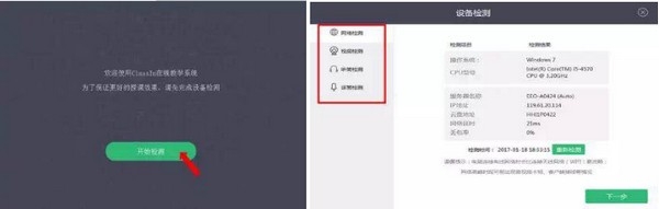 對(duì)于第一次安裝使用ClassIn的用戶,在登錄教室前,ClassIn會(huì)幫助您對(duì)您的網(wǎng)絡(luò)環(huán)境、以及音視頻設(shè)備進(jìn)行“體檢”,以確保您能正常上課。