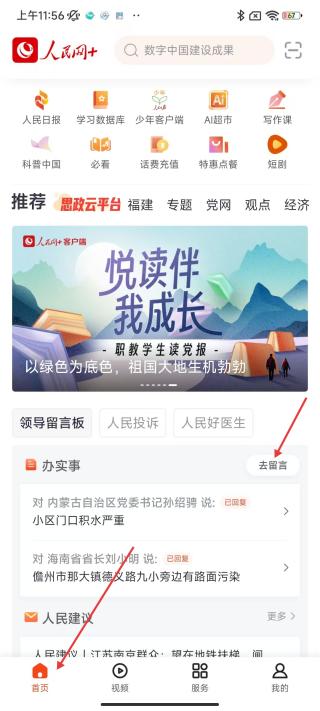 1、打開人民網(wǎng),點(diǎn)擊底部的首頁,在首頁界面中找到領(lǐng)導(dǎo)留言板,點(diǎn)擊去留言。