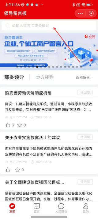 2、進(jìn)入領(lǐng)導(dǎo)留言板頁面后,可看到部委領(lǐng)導(dǎo)及地方領(lǐng)導(dǎo)相關(guān)留言,也可通過輸入留言ID或關(guān)鍵詞進(jìn)行搜索。