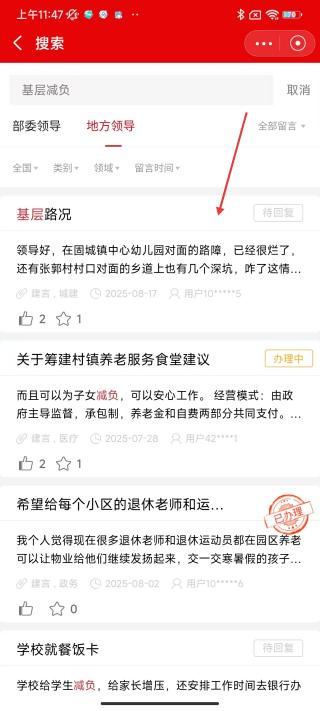 3、搜索完成后,在結(jié)果頁面點(diǎn)擊感興趣的留言條目,即可查看具體留言內(nèi)容及處理狀態(tài)。