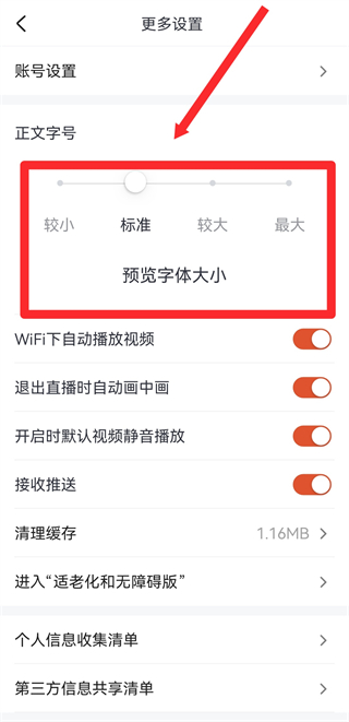 3、在頁面找到正文字號的區(qū)域,通過拖動滑塊選擇字號,完成設(shè)置操作。