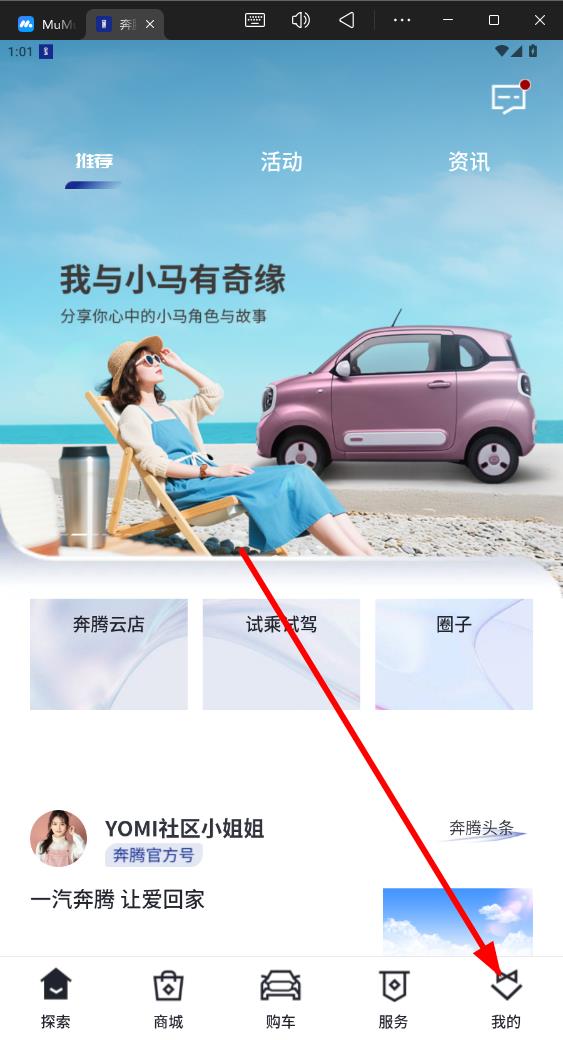 1、打開奔騰YOMI應(yīng)用,點擊底部導航欄中的我的,進入個人頁面。