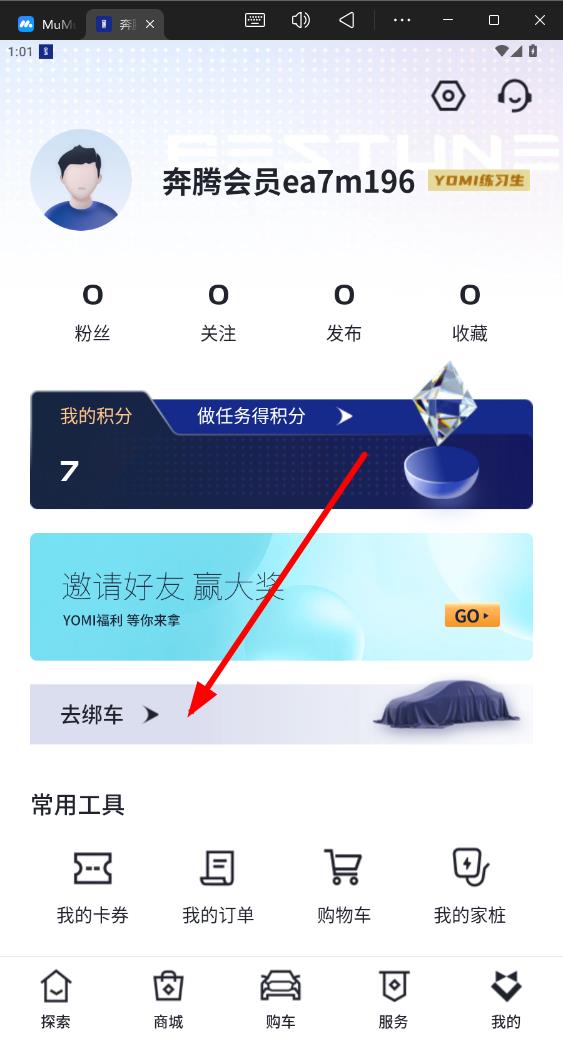 2、在個人頁面中,找到并點擊去綁車選項,進入我的車輛頁面。