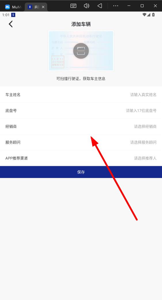 4、在添加車輛頁面,按要求填寫相關(guān)信息,選擇經(jīng)銷商等內(nèi)容后,點擊保存,完成車輛綁定。