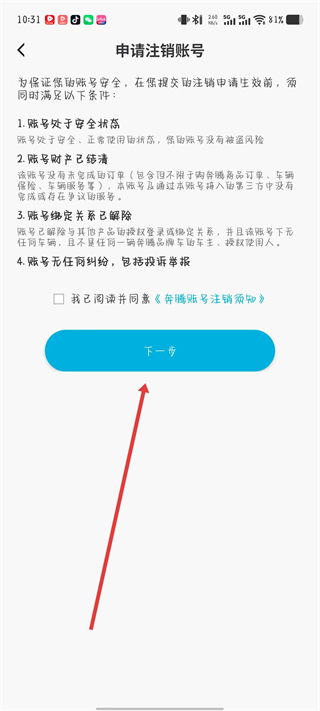 3、在申請注銷賬號的頁面,勾選須知點擊下一步按鈕。