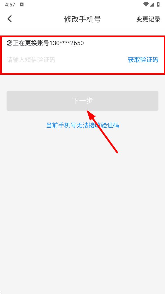 5、按提示獲取并輸入短信驗證碼,點擊下一步,輸入新手機號等信息完成修改。