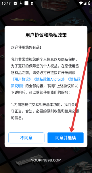 1、點擊“同意并繼續(xù)”,進入悠悠有品首頁。