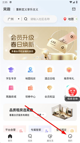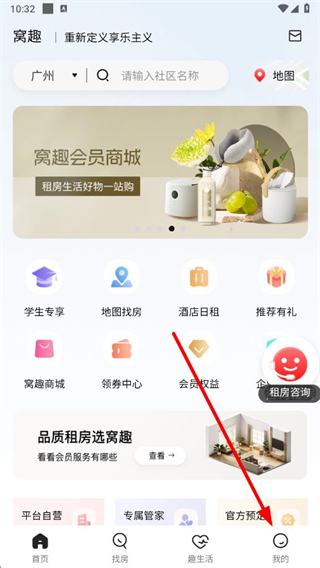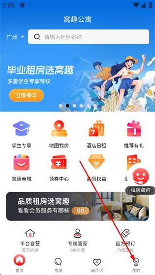 1、打開(kāi)窩趣公寓,點(diǎn)擊底部導(dǎo)航欄最右側(cè)的我的。
