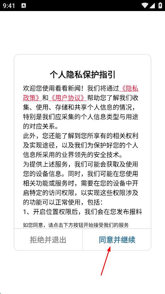 1、打開看看新聞APP,進入個人隱私保護指引頁面,閱讀相關內容后,點擊“同意并繼續(xù)”按鈕,進入APP主界面。