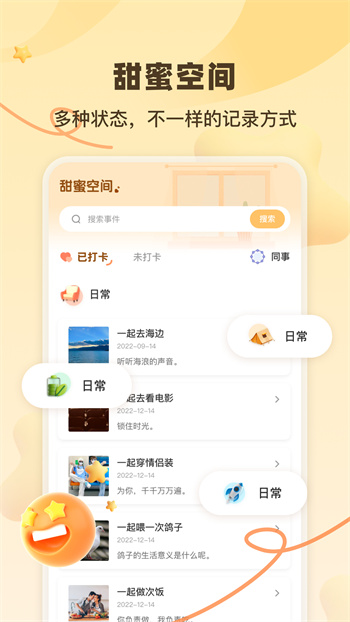 1,打卡和TA一起完成愛(ài)的100件小事,完成后添加至甜蜜空間,可以隨時(shí)查看