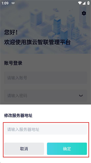 1、打開(kāi)旗云智聯(lián)管理平臺(tái),點(diǎn)擊界面右上角的設(shè)置圖標(biāo),彈出修改服務(wù)器地址窗口。