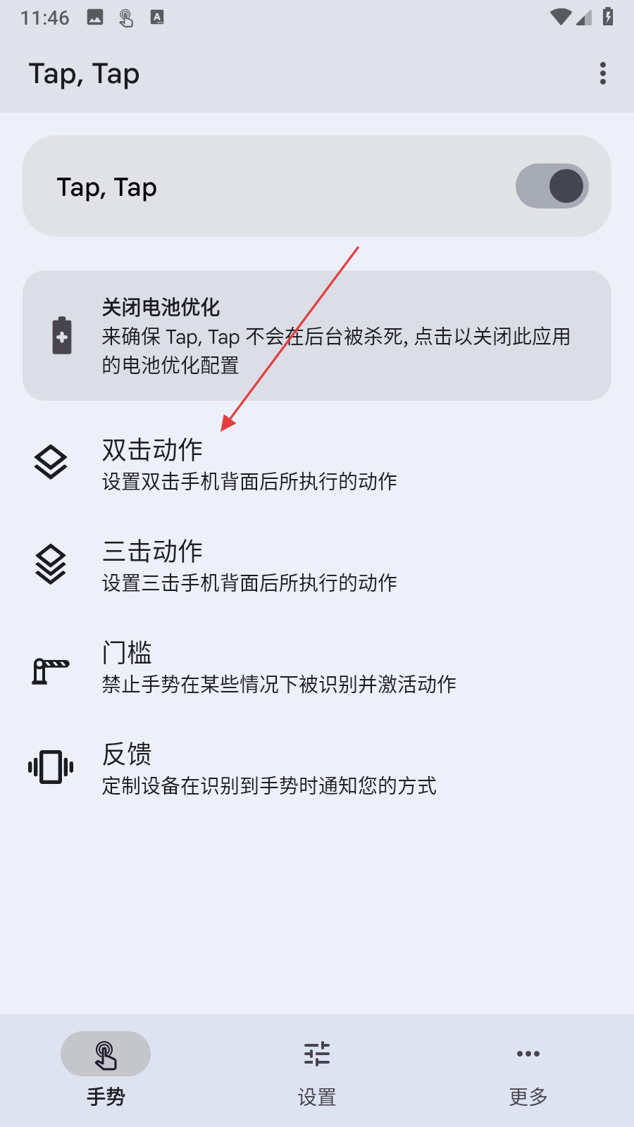 1、打開Tap,Tap應(yīng)用,在手勢頁面中找到雙擊動作選項,點擊進入雙擊動作設(shè)置界面。
