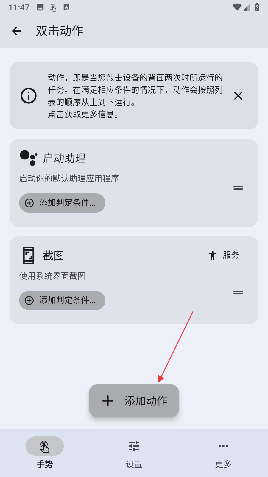 雙擊背部(Tap,Tap)是利用Android11代碼以識別雙擊設(shè)備背部手勢的一個應(yīng)用,支持Android7.0+的設(shè)備。您可以借助手勢來啟動應(yīng)用、控制設(shè)備(包括觸發(fā)HOME鍵,返回鍵,最近任務(wù)鍵等)、截圖、開關(guān)手電筒、啟動語音助手等等。利用「門檻」,您可以阻止手勢在屏幕關(guān)閉時、通話時、或者某個應(yīng)用啟動時等情況下工作。它使用無障礙服務(wù)來執(zhí)行這些動作,并保持在后臺運行。