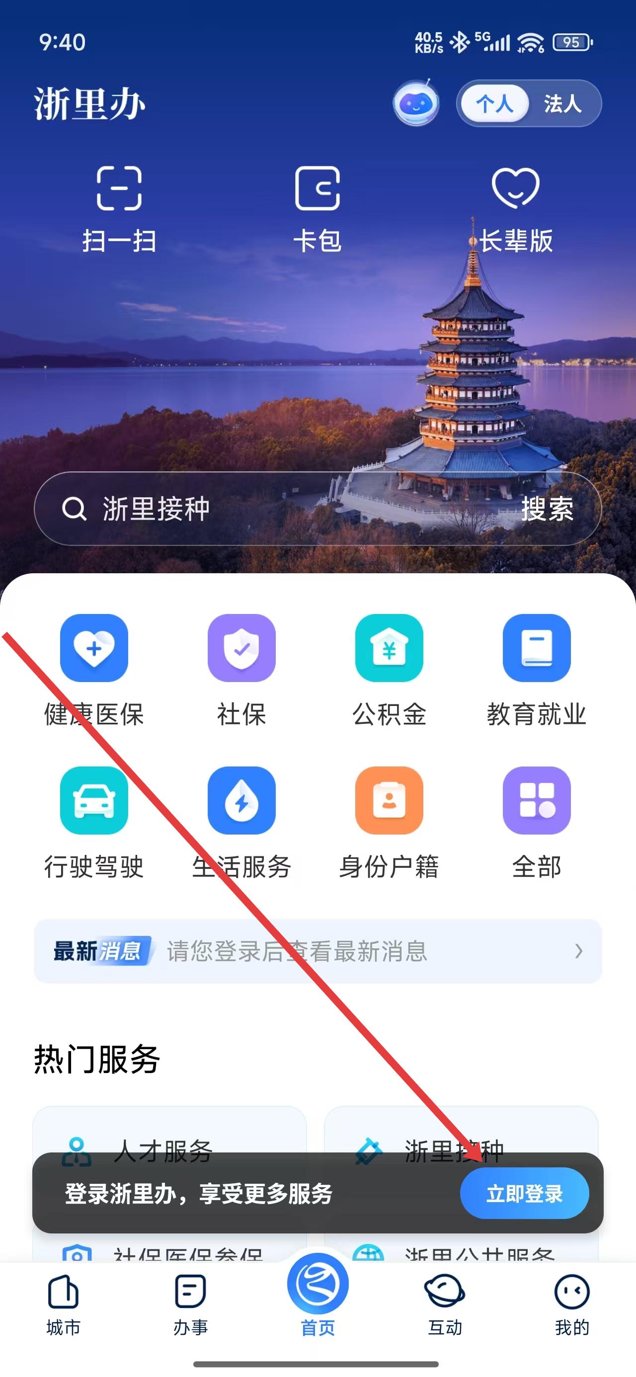 2、在浙里辦首頁(yè)中,可以點(diǎn)擊立即登錄按鈕,進(jìn)行登錄操作。