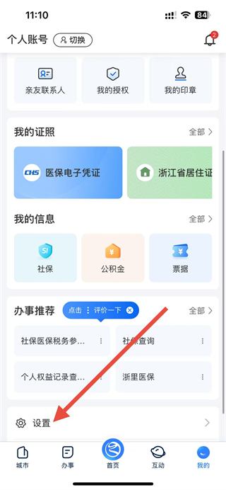 1、進(jìn)入浙里辦我的頁(yè)面,點(diǎn)擊頁(yè)面下方設(shè)置選項(xiàng)。