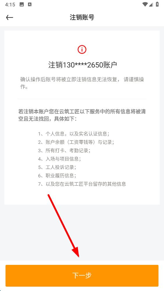 4、在注銷賬號提示界面,仔細閱讀相關(guān)信息后,點擊下一步,按照后續(xù)提示完成賬號注銷操作。