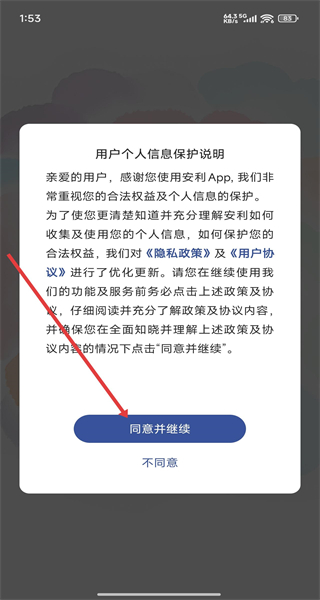 1、在打開安利App后,通過點(diǎn)擊彈窗中的同意并繼續(xù)按鈕,進(jìn)入使用。