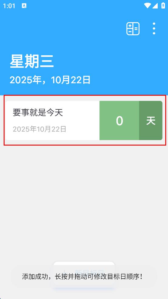 4、保存成功后,目標(biāo)日會(huì)顯示在主界面,可長(zhǎng)按拖動(dòng)修改目標(biāo)日順序。