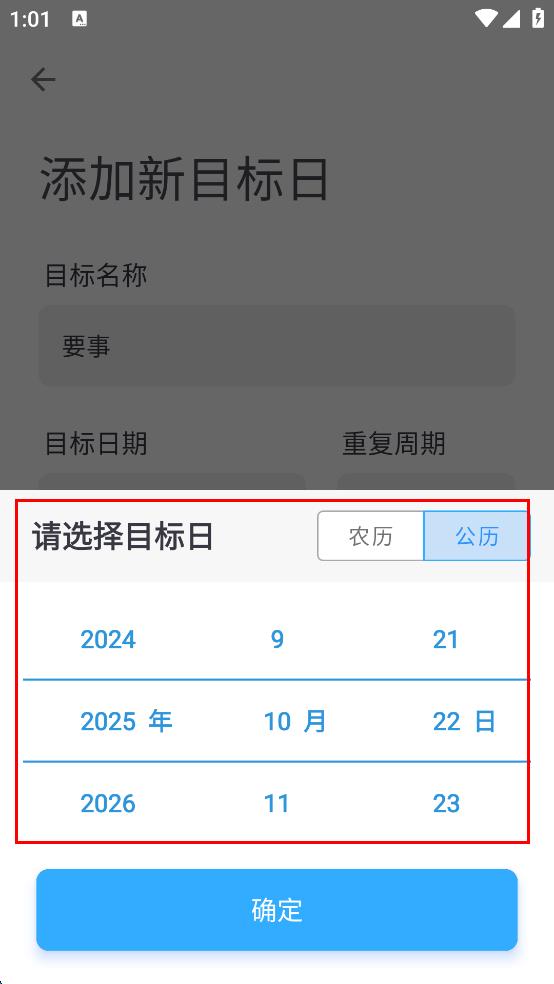 3、在選擇目標(biāo)日時(shí),可選擇公歷或農(nóng)歷日期,確定后點(diǎn)擊保存。
