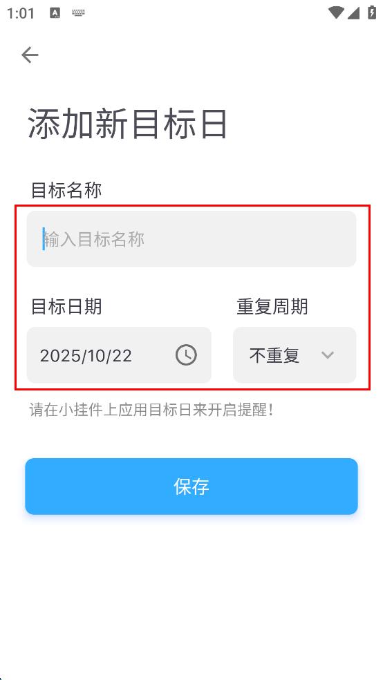 2、在添加新目標(biāo)日界面輸入目標(biāo)名稱(chēng),選擇目標(biāo)日期,設(shè)置重復(fù)周期。