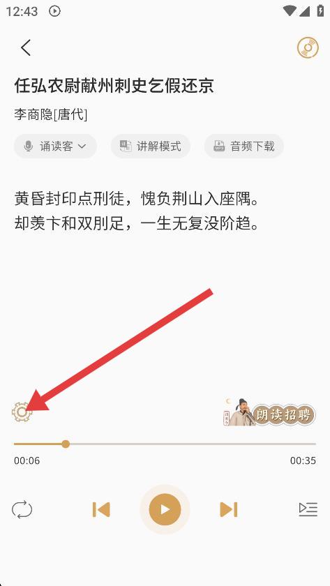4、進(jìn)入詩文播放頁面后,點擊左下角的設(shè)置圖標(biāo)。
