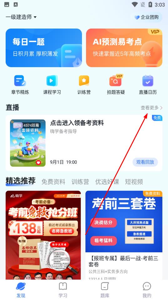 1、打開嗨學(xué)課堂App,找到直播板塊,點擊板塊右側(cè)的查看更多按鈕。