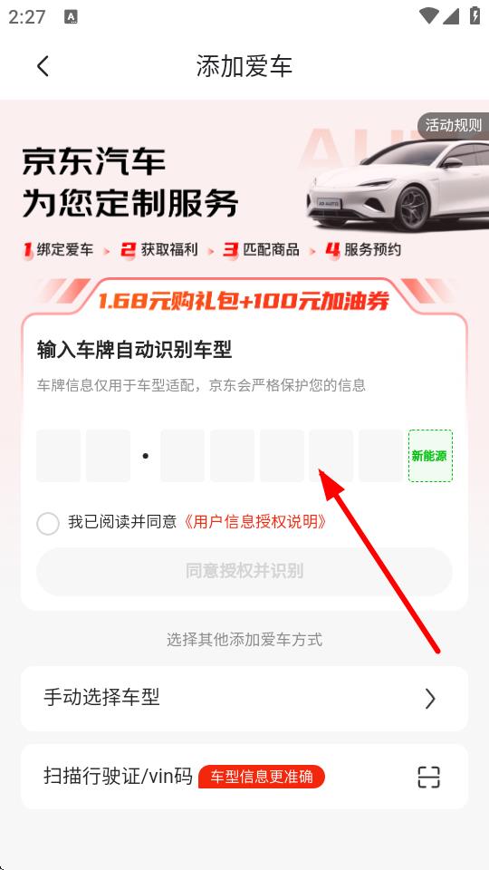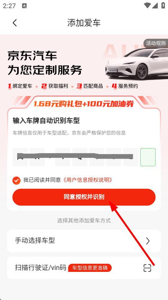 4、依次輸入車牌的字母和數(shù)字等信息,然后點(diǎn)擊同意授權(quán)并識(shí)別按鈕,即可完成車牌添加。