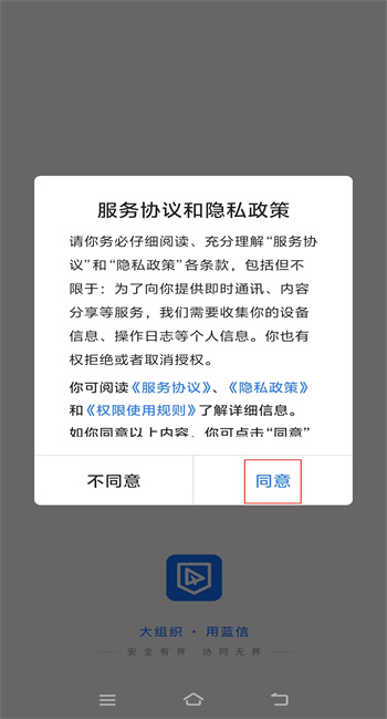 3、在成功申請完賬號之后,就可以在手機上下載這款軟件進行登錄操作,登錄賬號之前,直接點擊右下角的【同意】,完成應用的各個服務協(xié)議與隱私政策;