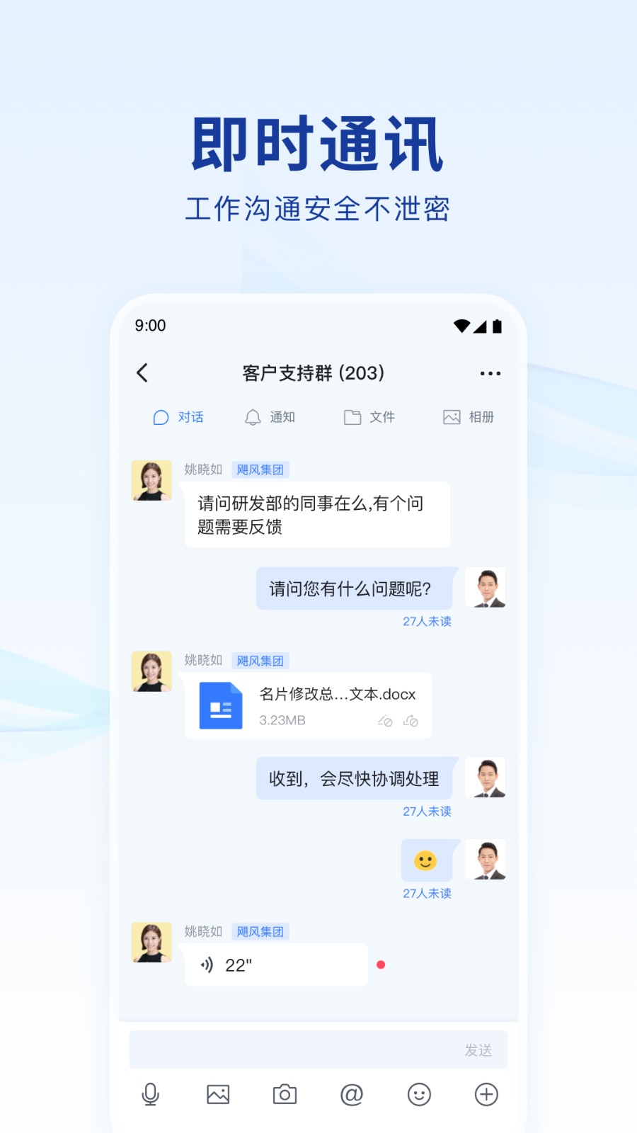 通過多種溝通方式,工作群組、音視頻會議、通知等功能滿足不同業(yè)務場景下的快速協(xié)同,增強組織對環(huán)境變化的感知能力和快速反應能力。