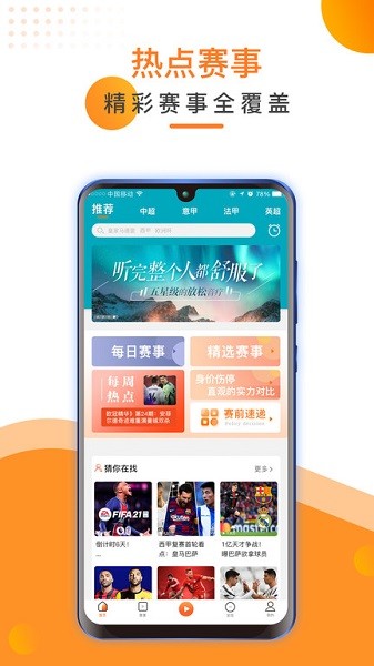 精彩賽事:英超聯(lián)賽、意甲聯(lián)賽、中超聯(lián)賽、法甲聯(lián)賽、日職聯(lián)、澳超、英冠、挪威超、瑞典超、感受精彩足球盛宴。