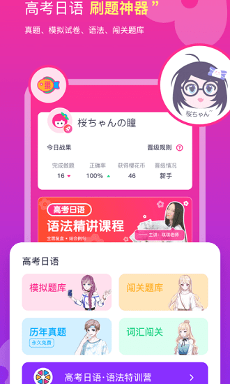櫻花斬App致力于為國內(nèi)日語學(xué)習(xí)者提供專業(yè)的學(xué)習(xí)平臺(tái)。內(nèi)容豐富翔實(shí),提供聽、說、讀、寫全方位的學(xué)習(xí)資料。形式多樣,滿足用戶多種需求,從日語入門到精通都有教程,不同階段不同課程,幫助用戶更快掌握日語知識(shí),提高學(xué)習(xí)效率,做你日語學(xué)習(xí)道路上貼心的好伙伴。